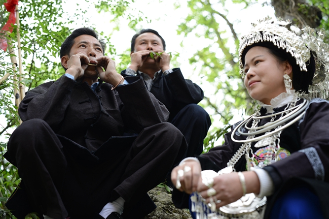 说到报京侗族“三月三”的历史渊源,报京大寨寨老邰湘权是这样告诉我们的。报京侗族“三月三”有讨葱节、播种节和情人节之称,其历史悠久。据乾隆《镇远府志》记载,此节已有200多年的历史。此节日的传说与古代农耕播种有关,它保留了侗族古代以桐树开花为春耕春种的古老记忆。据说在很早以前,侗族的祖公巴西年事已高,病卧在床。他知道自己不久将离开人世,就编歌一首传给子孙:“种稻季节最讲究,桐子花开要下种,早种晚种无收成”。于是,寨老决定以每年农历三月三为播种的日子。同时规定:在三月三吹芦笙、唱山歌,走亲会友,未婚男女邀伴玩山,大家兴高采烈地欢乐几天后,就把芦笙收起来,全力搞生产,直到秋后农闲时,再来吹芦笙、唱山歌庆丰收。有歌为证:“报京大寨三月三,活路要做花要攀,勤做活路生活好,攀花做完再农闲”。报京侗族“三月三”还是一个爱情悲剧的纪念日。相传很久以前,报京侗寨有一对青年男女相爱,男的叫桥生,女的叫良英。良英的父母嫌桥生家穷,不愿把良英嫁给桥生,硬是把良英许配给一个富家子弟。良英极力反对这门亲事,背离父母继续和桥生相亲相爱。三月初三这一天,良英到田里捞了鱼虾,到菜园里扯了葱蒜,约桥生到寨脚塘边的莫嘎树下相会。两人脱下草鞋挂在树上,表白忠于爱情生死在一起的决心,并到坡上煮食了葱蒜鱼虾,以誓永不分离。后来遭到寨头及族人的毒打,双双跳崖殉情。后人为怀念桥生、良英,反对封建包办婚姻,每年三月三,一对对青年男女便来到莫嘎树下谈情说爱,瞻仰桥生、良英留在莫嘎树上的鞋印。发誓要学桥生、良英一样,相亲相爱,忠贞不渝。