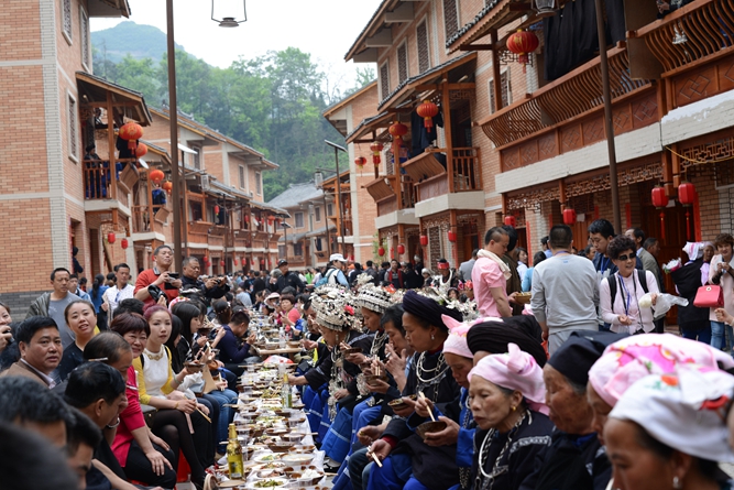欢跳芦笙舞。报京侗族同胞勤劳、淳朴、善良。贫瘠的土地永远割不断报京人民热情好客的难舍情结。捞鱼虾、讨葱蒜这两个活动结束后,在报京楼前的踩歌堂里,一曲团体的芦笙舞之后,身穿节日盛装的青年男女们手拉手,伴随芦笙舞的旋律轻歌曼舞。芦笙声、金银首饰摆动声、青年男女的欢呼声相互交织在一起,使宁静的报京一下子沸腾起来。主客手拉手围成一圈又一圈,踩着鼓点欢快起舞。直到血红的残阳躲进西山,青年男女才依依不舍地离开。芦笙舞散后,主人们各自邀请宾朋到自己家中品尝侗家长桌宴,长桌宴不散,宾朋怎能舍得走。