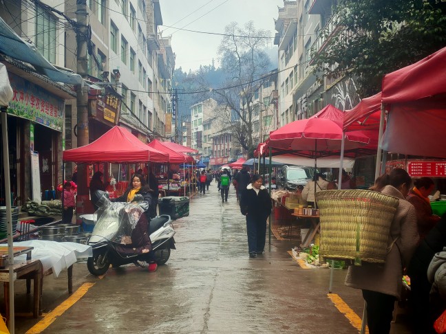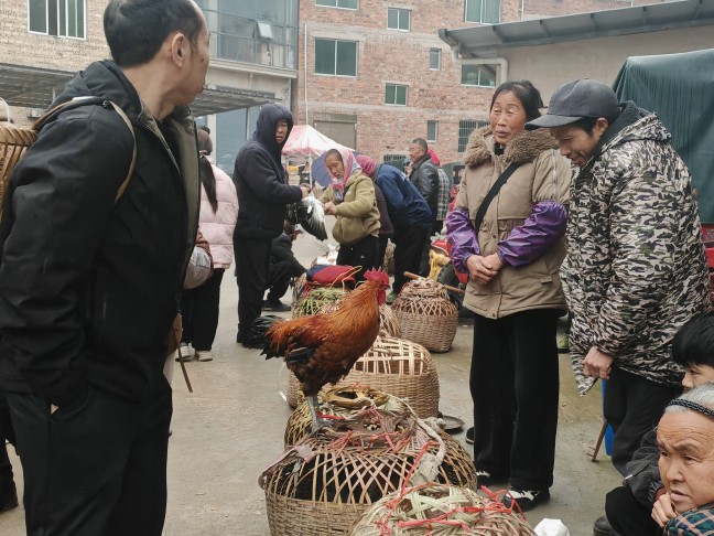 菜市场里,讨价还价的声音、孩童的欢笑声交织成一片,村民们背着竹编背篓穿梭其间,背篓里渐渐装满鸡鸭鱼肉和水灵灵的新鲜蔬菜,每个人脸上都漾着满足的笑意。