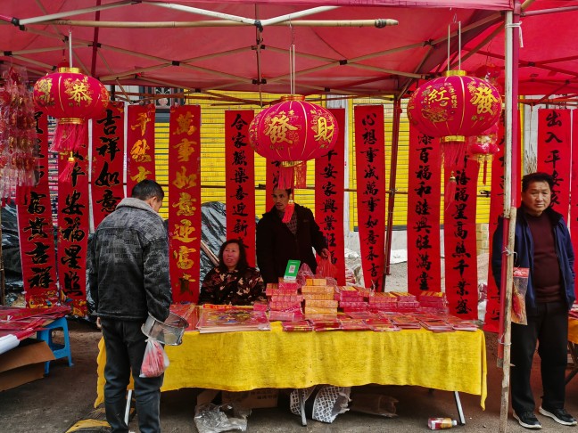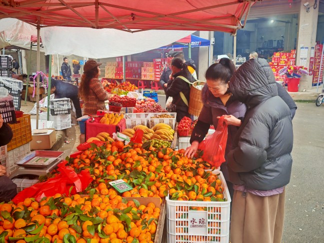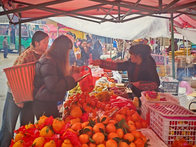 穿过中街,农贸市场内更是人声鼎沸。卖对联的摊位前挤满了顾客,鲜艳的“福”字和窗花在风中摇曳,老板吴叔叔麻利地打包着顾客选中的春联。水果区生意兴隆,柑子、苹果堆得像小山丘,商贩们一边麻利地称重收款,一边笑着和熟客打招呼。