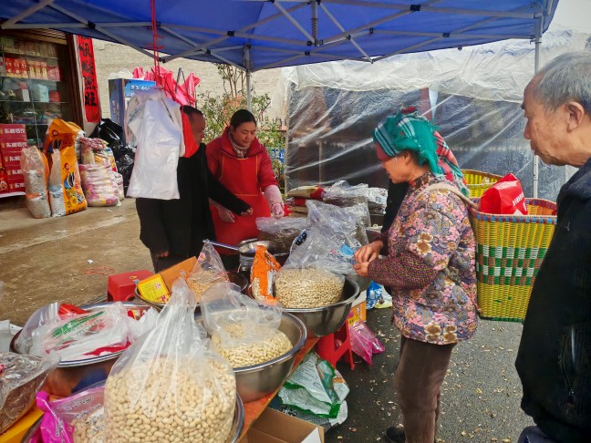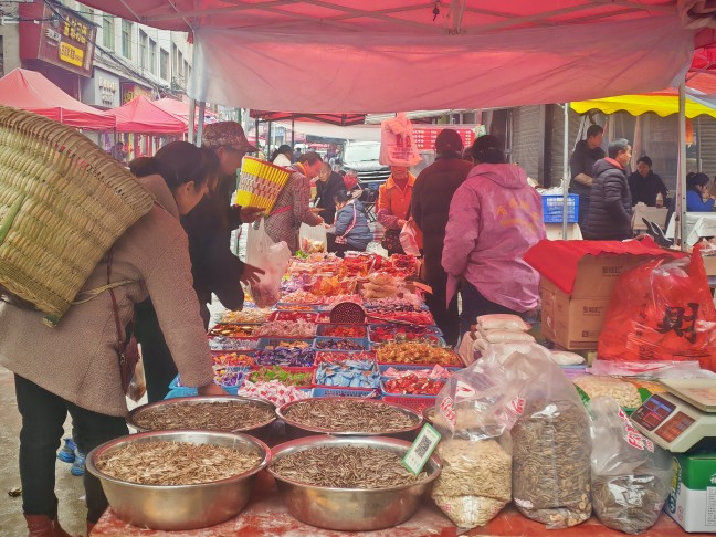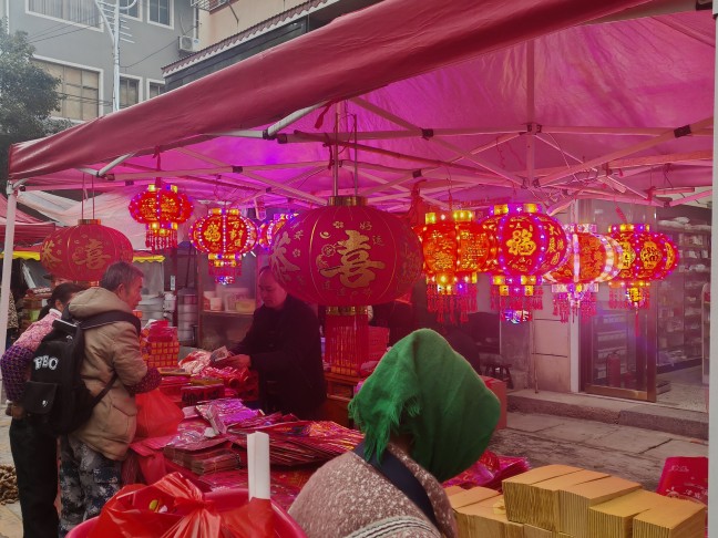 这赶年场的热闹劲儿,可比平日里的集市浓得多:还没踏入集市区域,就已经听到此起彼伏的吆喝声;红彤彤的春联、五彩斑斓的糖块、颗粒饱满的瓜子干果,满满当当地堆在各个摊位;乡亲们提着布袋、挎着竹篮,在摊位间细细挑选心仪的年货。